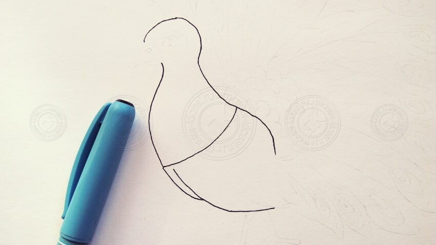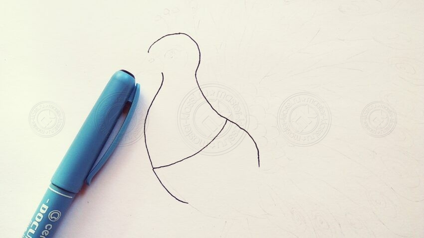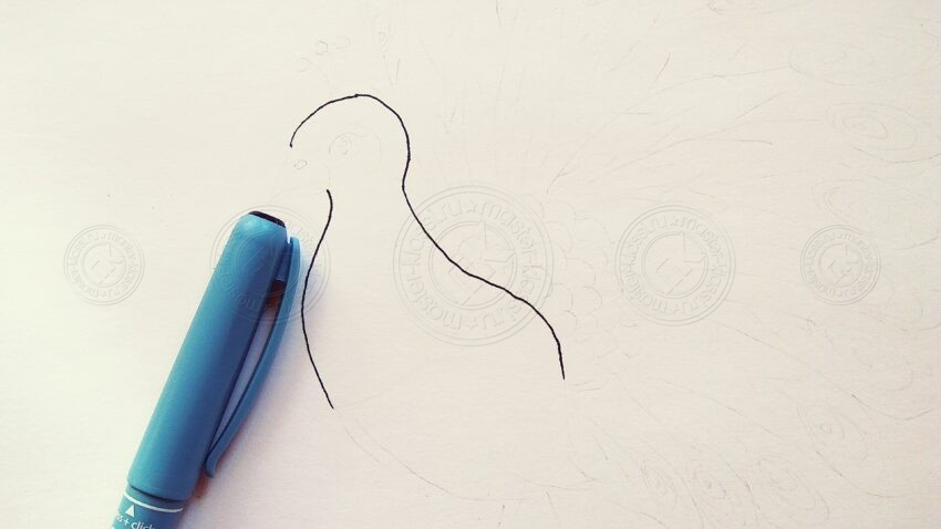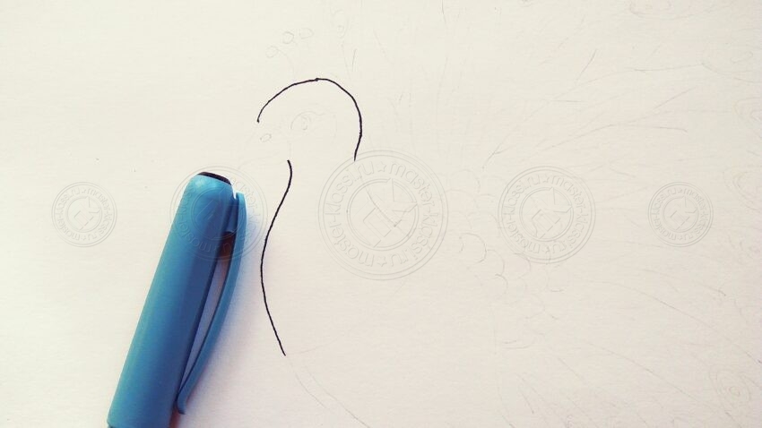 Но главное внимание мы уделим, конечно же, хвосту, и здесь прорисуем в отдельности каждое перо, покажем необычный орнамент. Нарисуйте дугу, очерчивая голову