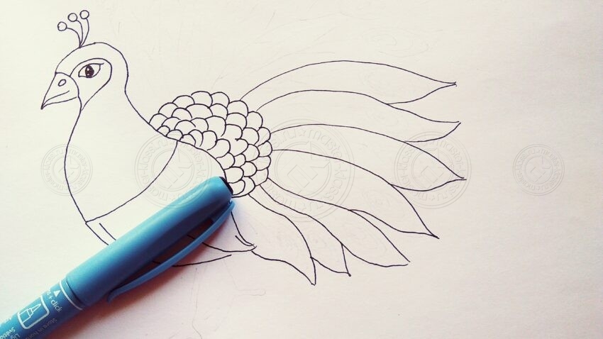 - Начать рисовать павлиний хвост. Сначала взяться за часть, расположенную в центре. Перья хвоста должны вытягиваться от туловища к внешним краям. При этом они не должны плотно прилегать друг к другу. Между ними следует оставлять небольшие промежутки.