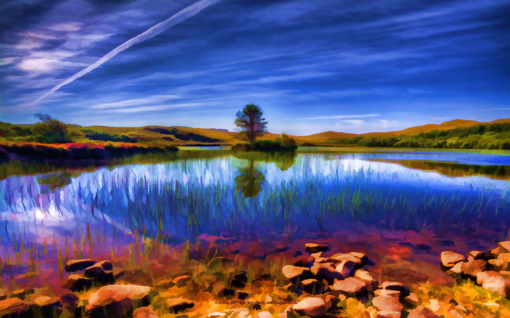 Разукрашиваем речку от самых светлых оттенков медленно переходя к темно-фиолетовым текстурам. Тоненько прорисовываем рябую водную гладь с небольшими волнами.