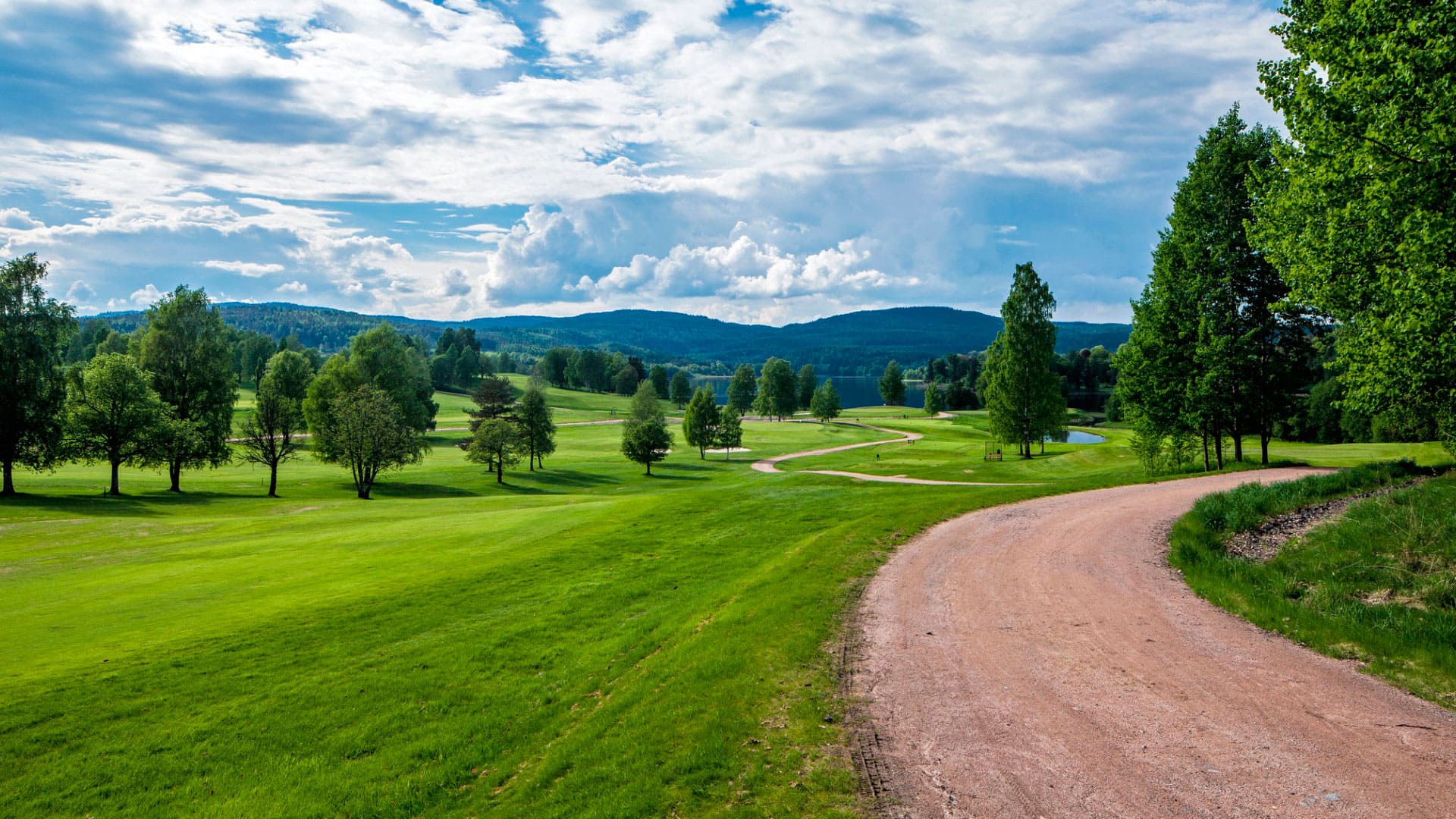 Передний берег раскрашиваем темно-зеленной гуашью, оставляя пустую извилистую дорогу. Поверх заливки более светлым пигментом пририсовываем пушистую травку.