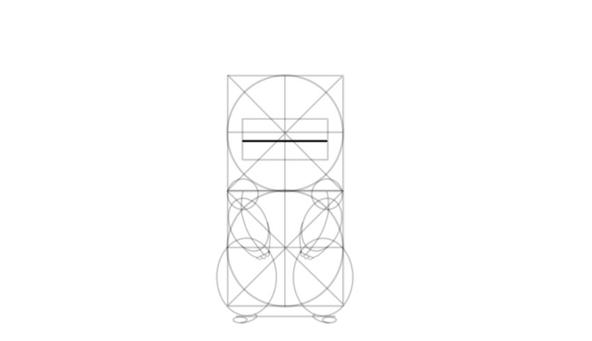 - Обозначим голову нашего героя и туловище. Необходимо отметить, что голова у него имеет форму прямоугольника, а туловище форму квадрата.