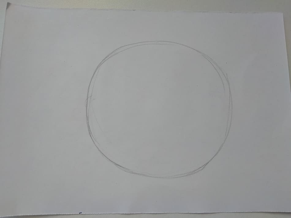 Шаг 1. Предлагаю взять половинку от альбомного листа. Так будет удобнее понимать масштаб рисунка. Далее в центре от руки рисуем круг. Если он получится не очень ровным, не стоит переживать. Это же детское творение, а не чертеж. У меня получилось так.