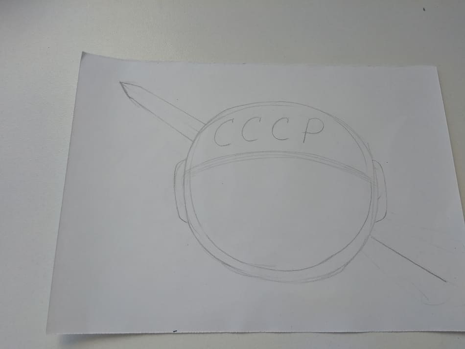 Изображать будем легендарный советский шлем от скафандра и ракету «Восток». Именно на ней Юрий Гагарин совершил героический полет вокруг Земного шара 12 апреля. Конечно, все детали мы не будет прорисовывать. Главной, подхватить общий силуэт.